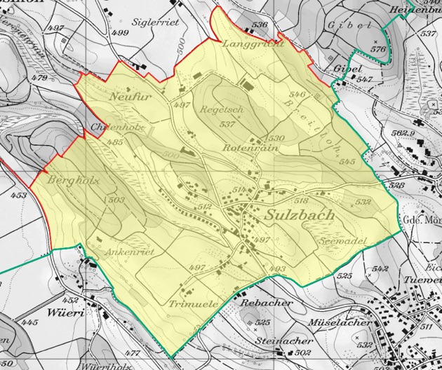 Ortskarte von Sulzbach, Grüne Linie bedeutet Gemeindegrenze, rote Linie bedeutet Ortsgrenze