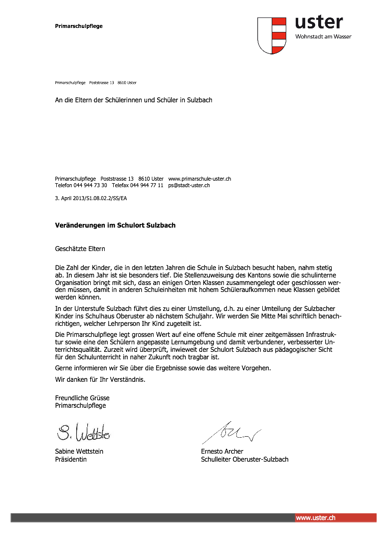 Für weitere Auskünfte wenden Sie sich bitte direkt an die Primarschulpflege der Stadt Uster.