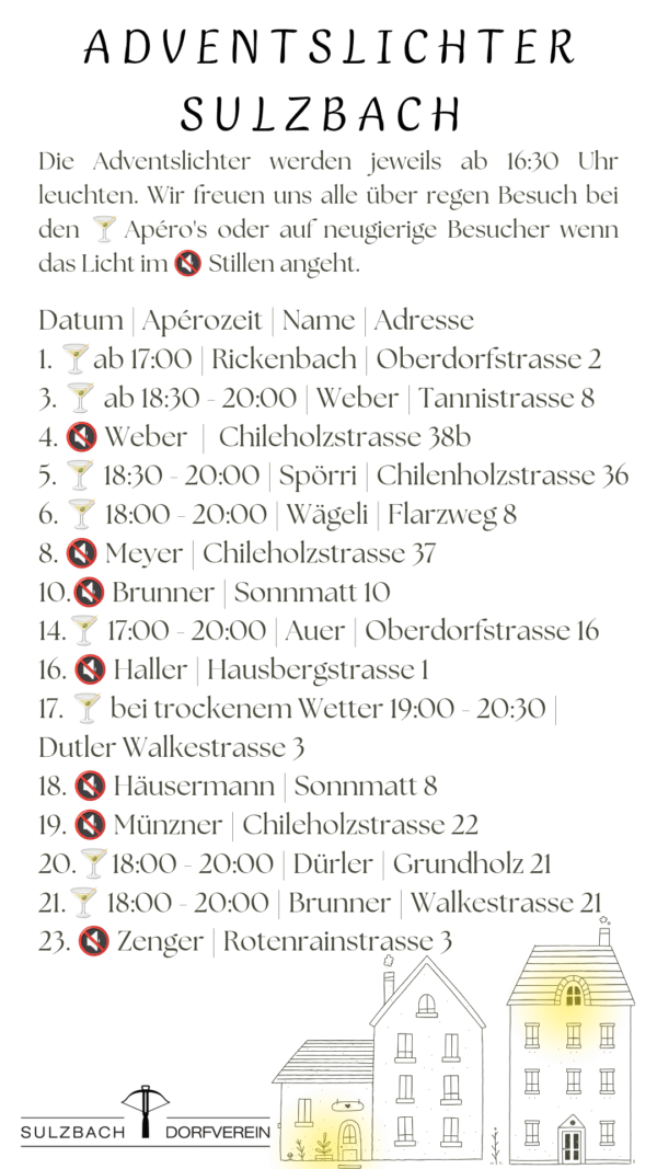 Liebe Sulzbacherinnen und Sulzbacher, der Dorfverein Sulzbach lädt wieder herzlich zum traditionellen Dorffest ein! Kommt vorbei und feiert mit uns den Sommer und das Leben «i oisem schöne Dorf». Um 17:00 Uhr findet zudem eine Andacht im Schulzimmer statt. Weitere… Weiterlesen →